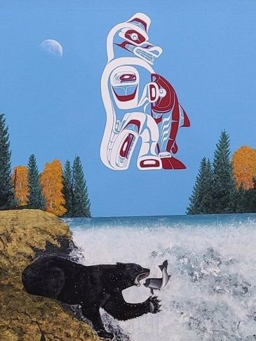 Born in Naniamo, BC in 1960 of Nuu Chah Nulth and Coast Salish ancestry. Rays grandfather Wallace Touchie was a Nuu Chah Nulth carver and canoe builder, father Wilson Bob Jr, and was a carver and artist, who received teaching from late George Clutesi. Much of Rays work is done by using Red cedar and Yellow cedar panels using the natural colour of the wood and grain. Although Ray does work on canvas's, he loves the feel of cedar. Ray is largely self taught, many of his art pieces are based on legends of the Pacific North west coast and he has been painting since 1986.